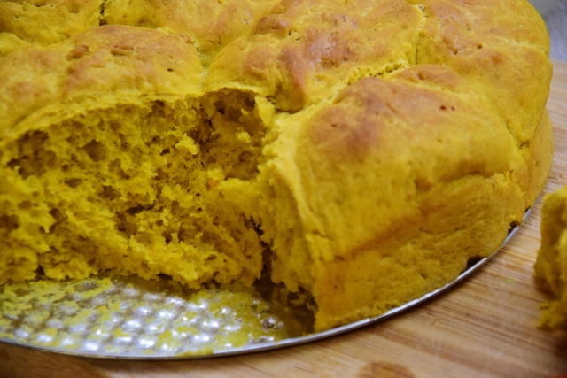 Do ciasta drożdżowego dodaje się samodzielnie zrobiony mus z dyni – efekt jest niesamowity – bułeczki zyskują przepiękny żółty ciepły i słoneczny kolor, a do tego są wilgotne, lekko słodkie w smaku i długo pozostają świeże.