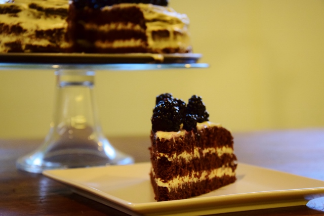 5. Pierwszy blat posmarować 1/3 kremu, położyć kolejny blat, posmarować kolejną porcją kremu, położyć ostatni blat. Posmarować wierzch i boki ciasta resztą kremu. Wierzch udekorować na przykład jeżynami.