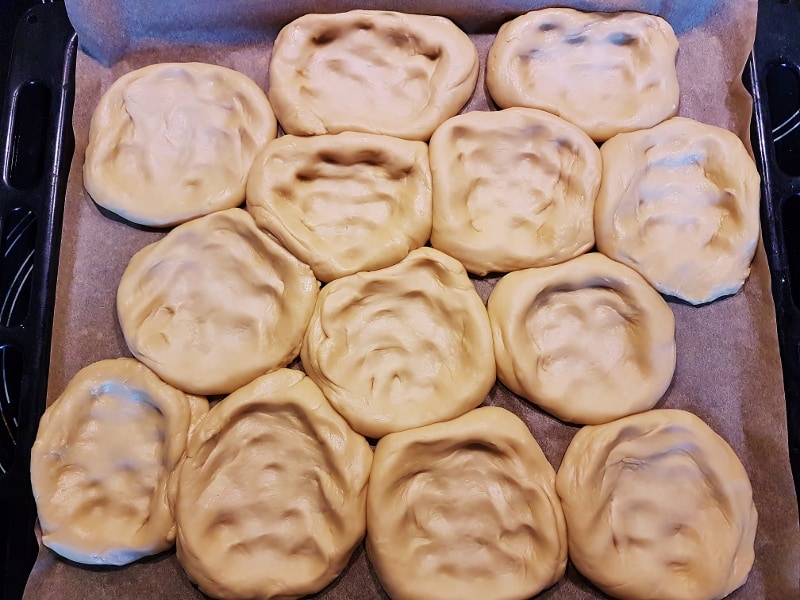 3. Ciasto wyjmujemy, dzielimy na 12 kawałków. Z każdego formujemy mały placuszek o średnicy ok. 10cm. Układamy je na blasze i zostawiamy do wyrośnięcia na około 30 minut. Po tym czasie w naszych placuszkach robimy wgłębienia.