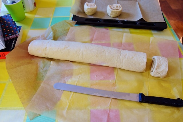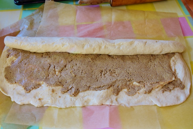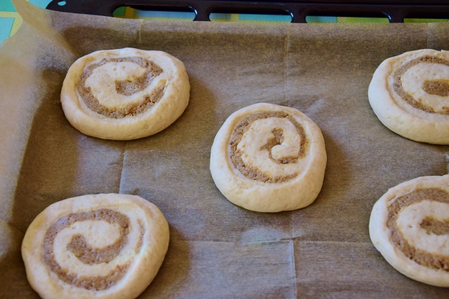 4. Wyrośnięte ciasto rozwałkować na papierze do pieczenia aby uzyskać prostokąt o wymiarach 30x60cm. Rozwałkowane ciasto posmarować pastą z tahini – zostawiając 2cm margines. Następnie pomagając sobie papierem zwinąć ciasto w ciasną roladę – począwszy od dłuższej krawędzi. Następnie roladę pokroić na plastry o grubości 3cm, przełożyć je na wyłożoną papierem do pieczenia blachę – zostawiając 5cm odstępu pomiędzy. Zostawić do wyrośnięcia na 15minut, rozgrzać piekarnik do 180 stopni C.