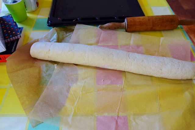 Ciasto się fajnie wałkuje, nie klei się do rąk, łatwo było je zrolować i przełożyć na papier do pieczenia.