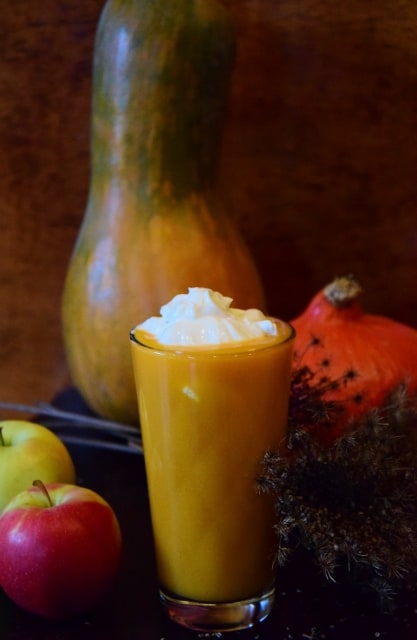 Proste połączenie trzech owoców czyli dyni, jabłka i ananasa z dodatkiem bitej śmietany jeśli ktoś chce wersję rozpustną i jest – cudownie pachnąca i jeszcze lepiej smakująca mikstura, prawdziwie magiczna. Kolor jest niesamowity, konsystencja kremowa, no bajka, bajka, bajka.