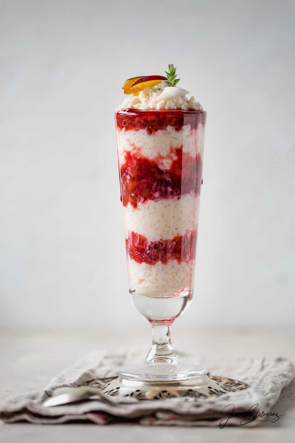 4. W wysokiej szklance lub kieliszku układać warstwami na zmianę ryż na mleku i sos śliwkowy.