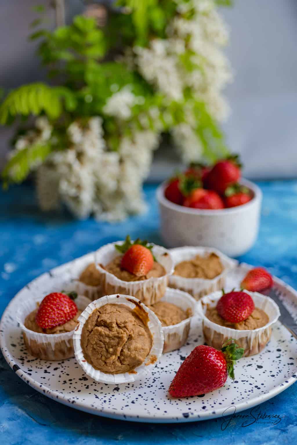 6. Muffiny są smaczne na ciepło i na zimno, można je podawać z pokrojonymi truskawkami lub posypane karobem.