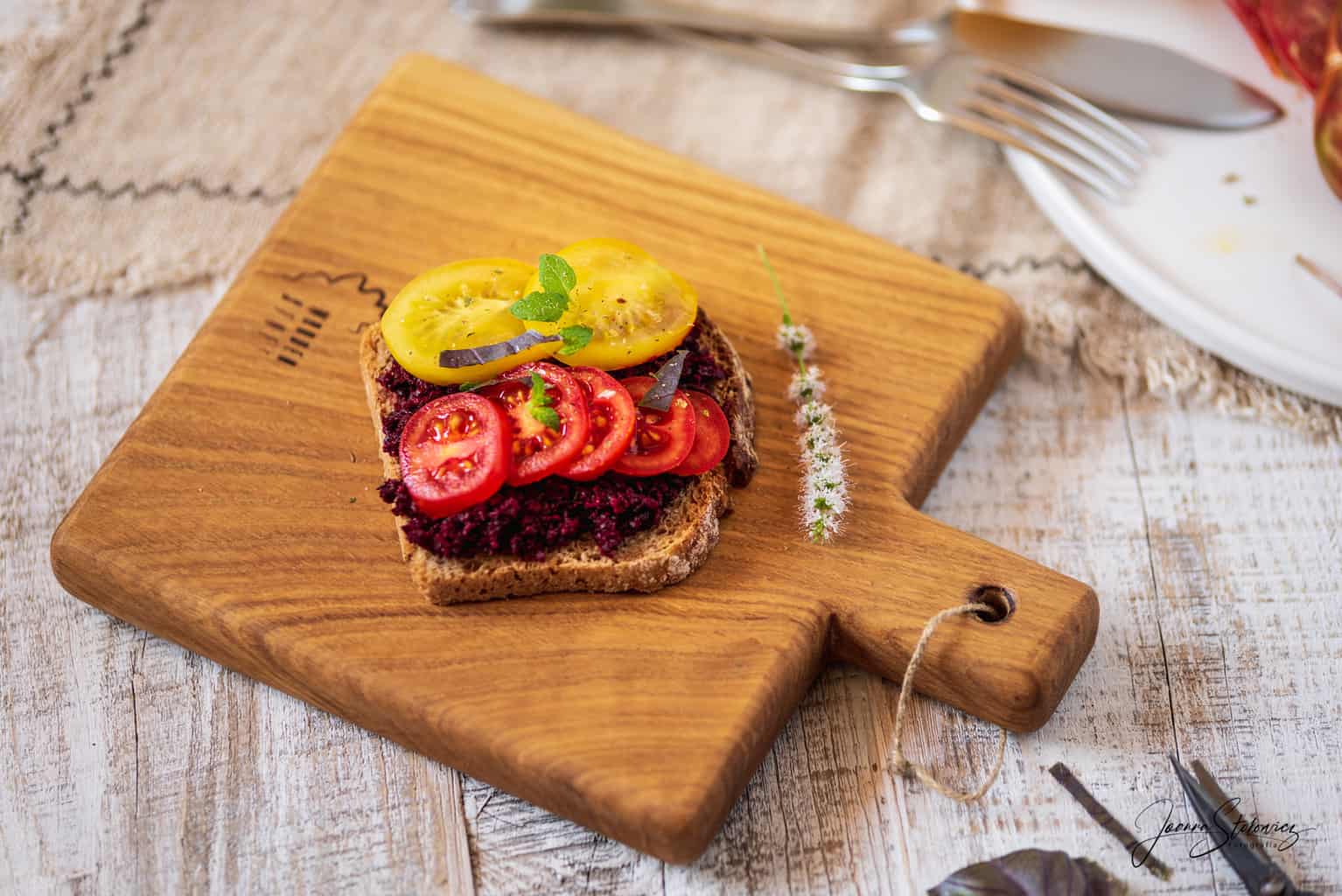 Uwielbiam takie połączenia smaków, uwielbiam warzywa korzeniowe, wokół czuję jesień. Z powodu suszy wszystko w moim ogródku wyrosło o wiele później – dopiero teraz mam swoje buraki ćwikłowe i własne pomidory. To jest połączenie doskonałe – chleb żytni na zakwasie, pasta z pieczonego buraka ćwikłowego i plasterki pomidorów.