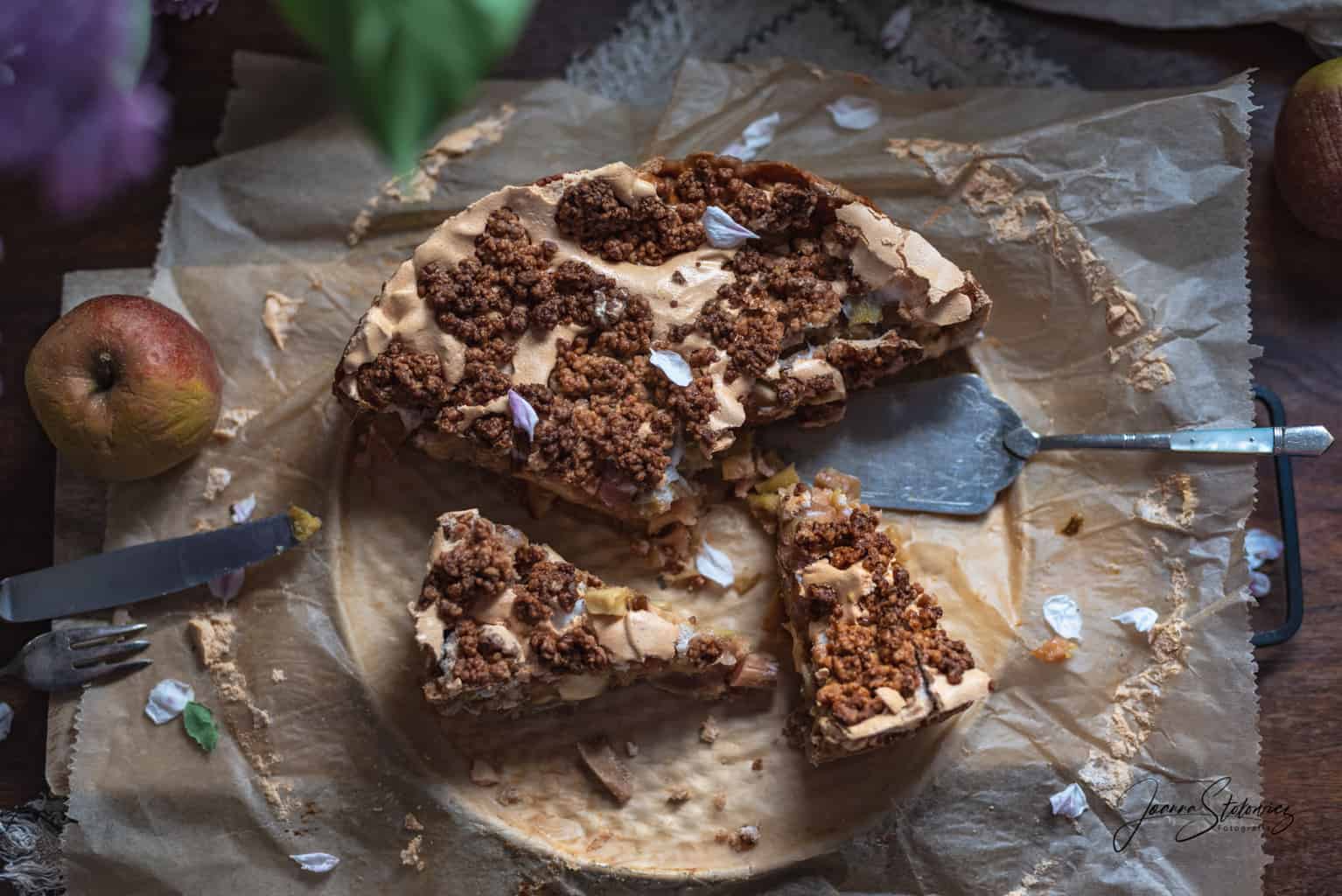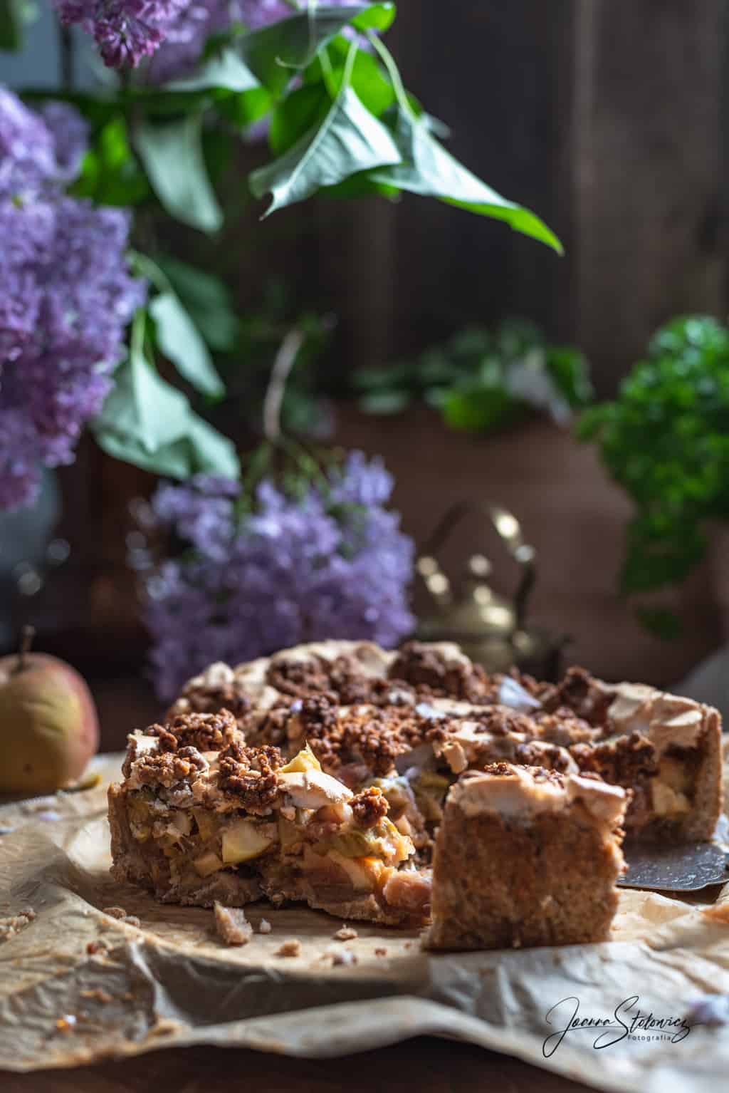 Wracając do ciasta – wyszło świetne. Razowe ciasto kruche, środek z jabłek i rabarbaru z nutą brzoskwini dzięki galaretce, beza i razowa kruszonka, to brzmi, wygląda i smakuje świetnie.