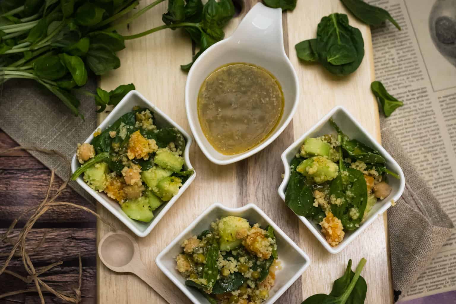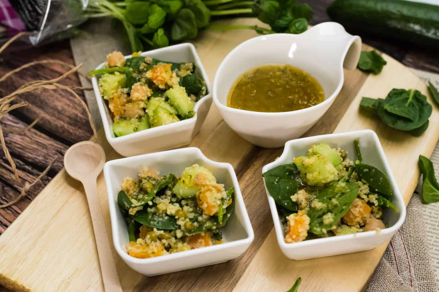 5. Do dużej miski, do której włożyliśmy orzechy z oliwkami, przełożyć dynię, groszek i kaszę kuskus. Dodać do nich 100g świeżego szpinaku, 400g ciecierzycy z puszki (oczywiście odsączonej) i 400g świeżego ogórka obranego i pokrojonego na 1cm kawałki. Wszystkie składniki wymieszać. Jeśli sałatka będzie zjedzona od razu – polać ją sosem i wymieszać dokładnie. Jeśli będzie jedzona później lub porcjami, trzeba ją polać sosem tuż przed zjedzeniem. Jeśli zrobisz to zbyt wcześnie sałatka straci smak.