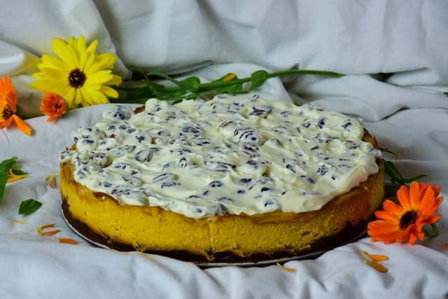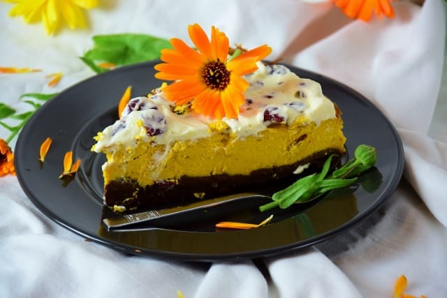 Na cookidoo jest kolekcja poświęcona dyniom, z niej właśnie zaczerpnęłam ten przepis (oczywiście został zmodyfikowany). Dynia w serniku nadaje pięknego koloru ale sernik nadal smakuje jak sernik. Czekoladowy spód się ciekawie komponuje z resztą ciasta, a jeśli jeszcze zrobisz bitą śmietanę i połączysz ją z żurawiną – otrzymasz poezję smaków. Nie wiadomo czym się bardziej zachwycać, chyba całością. 😉