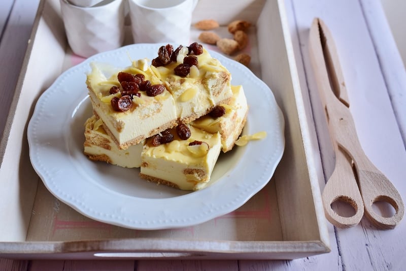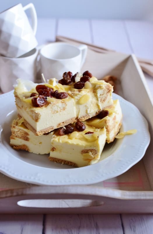 4. Na dnie blachy o wymiarach 30x24x6 wyłożonej papierem do pieczenia ułożyć warstwę herbatników. Wylać na nią połowę gorącej masy. Na masę ułożyć pozostałe herbatniki. Na nie wylać resztę masy. Wierzch udekorować rodzynkami i płatkami migdałów.