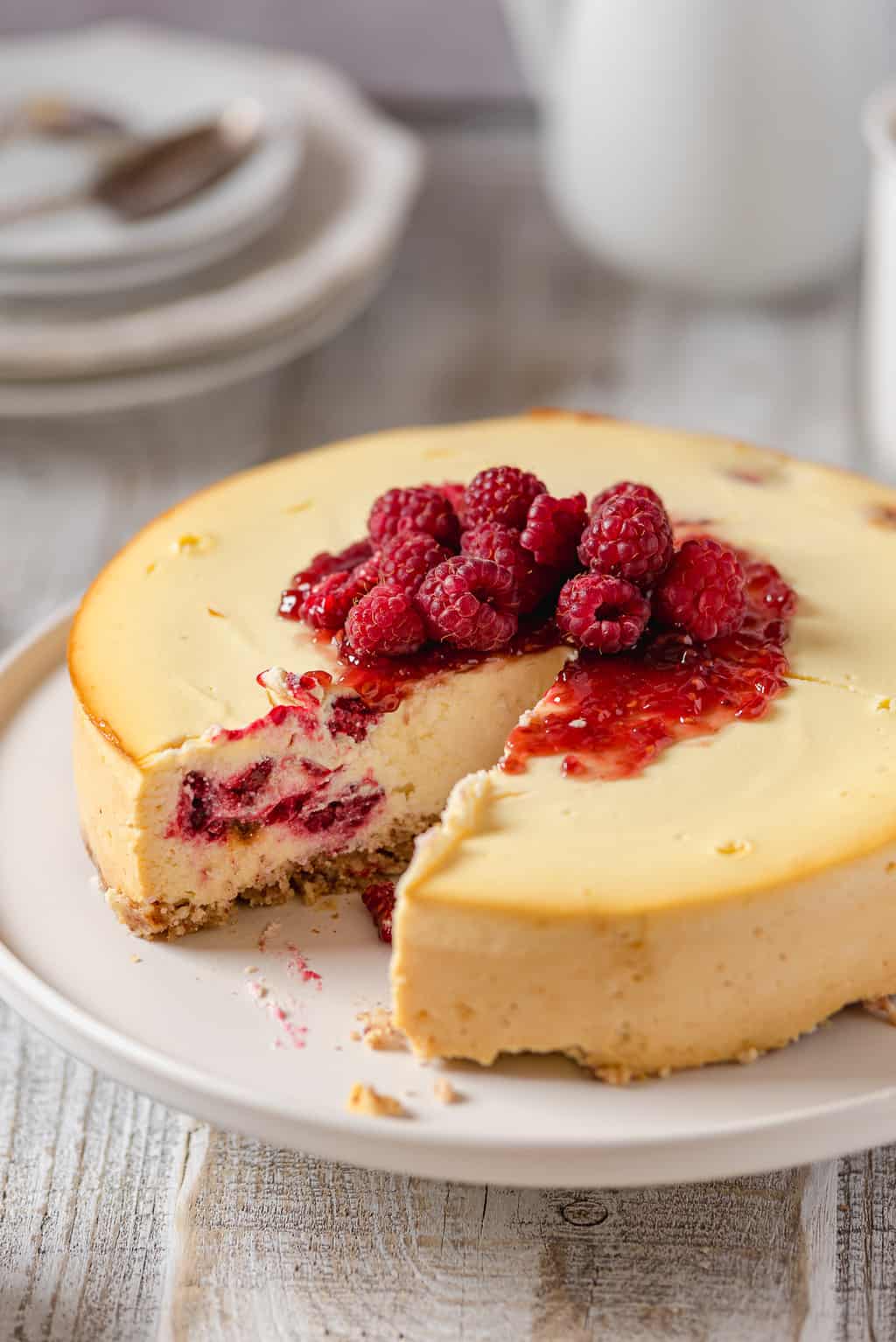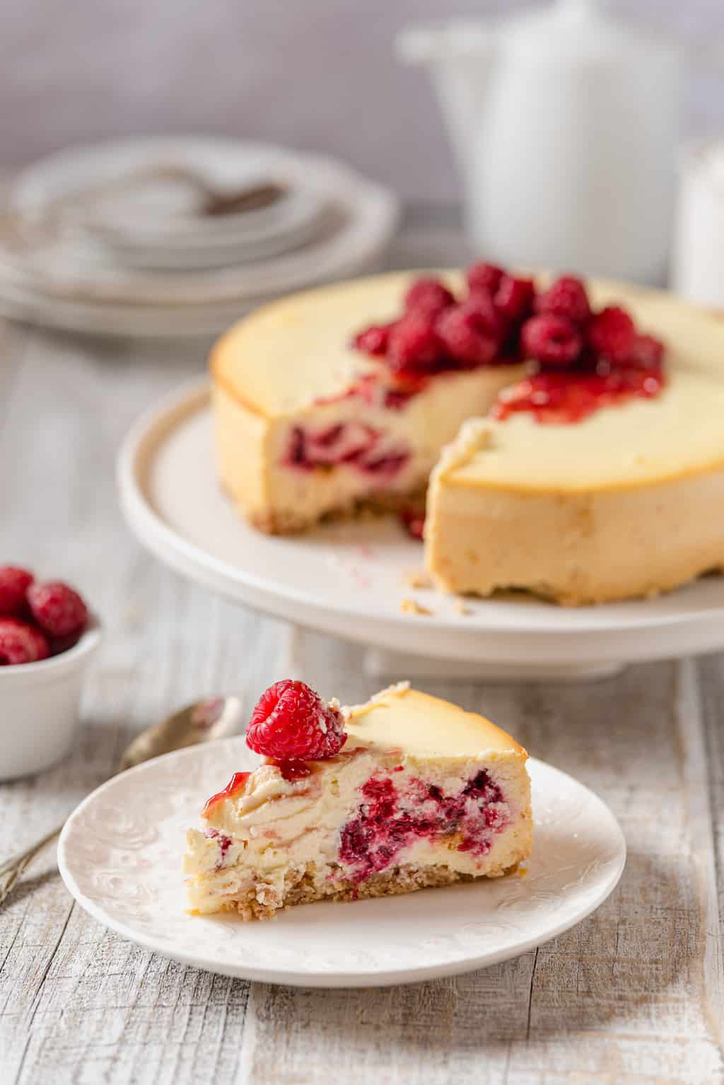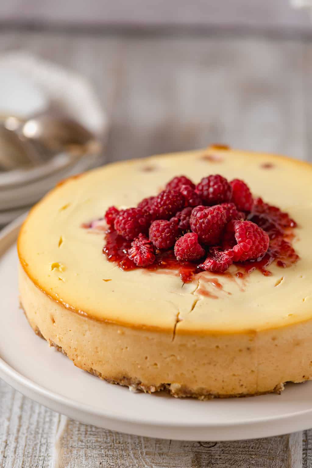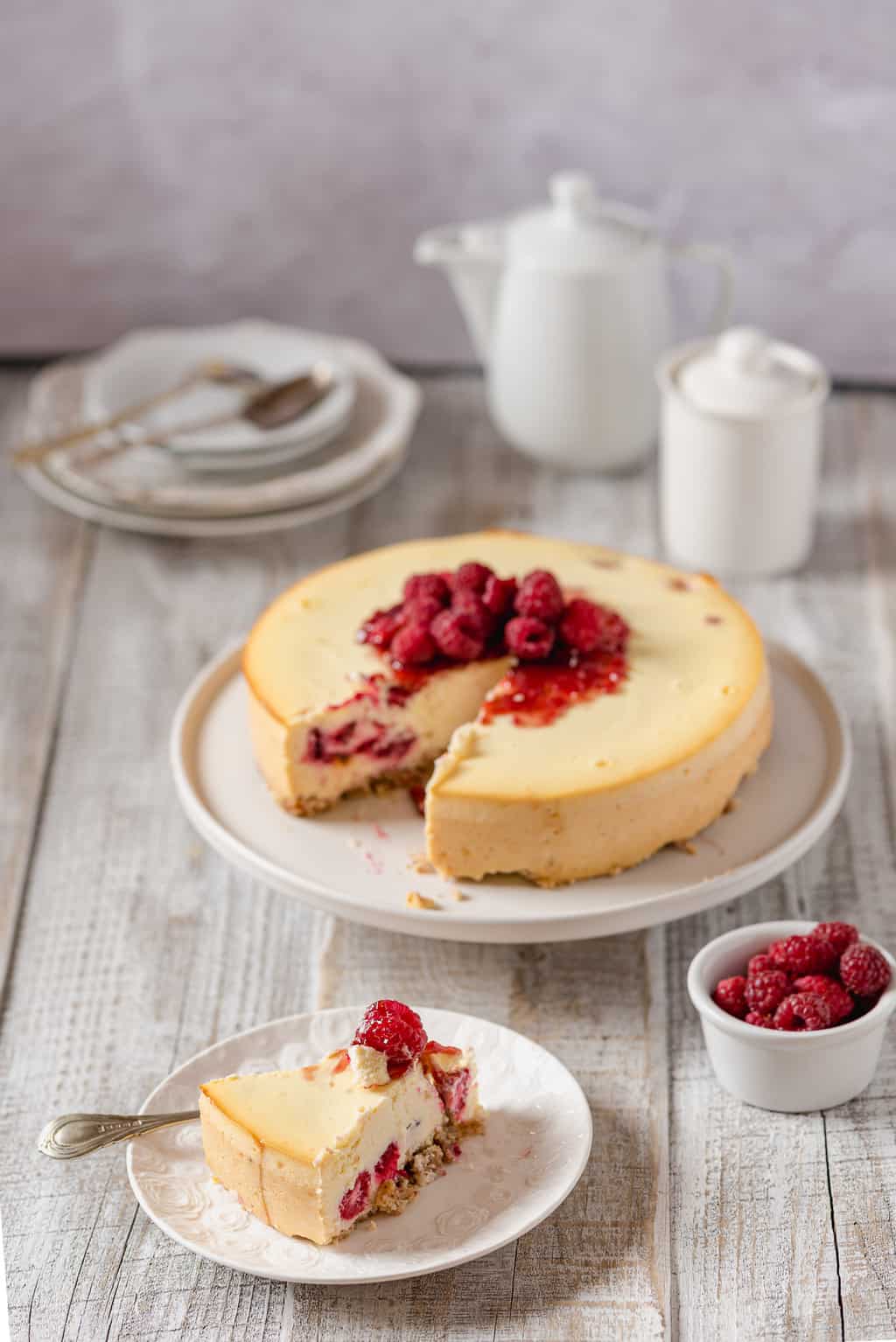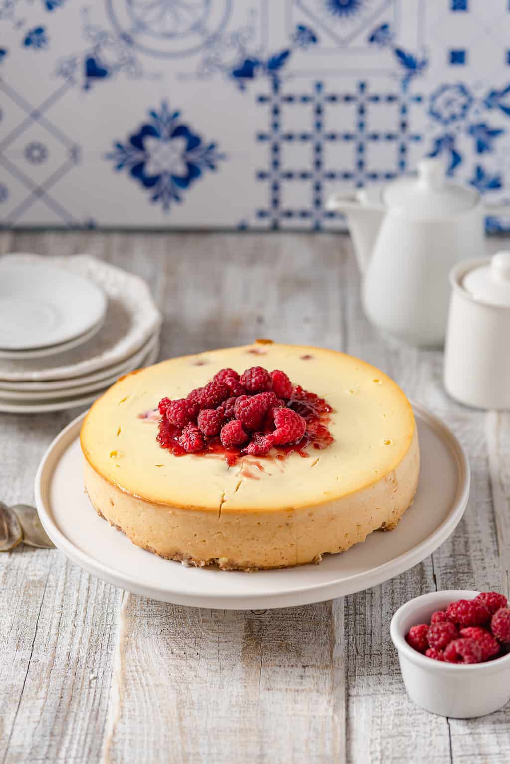 Sernik w moim domu, aby spełnił standardy rodziny, musi być wilgotny i taki jakby smarowalny. W żadnym wypadku nie przejdzie żaden suchy, kruszący się czy ciężki niczym głaz. Ten sernik z serem ricotta i malinami (chociaż można użyć dowolnych owoców jagodowych) spełnia wszelkie wyśrubowane normy domowych sernikożerców.