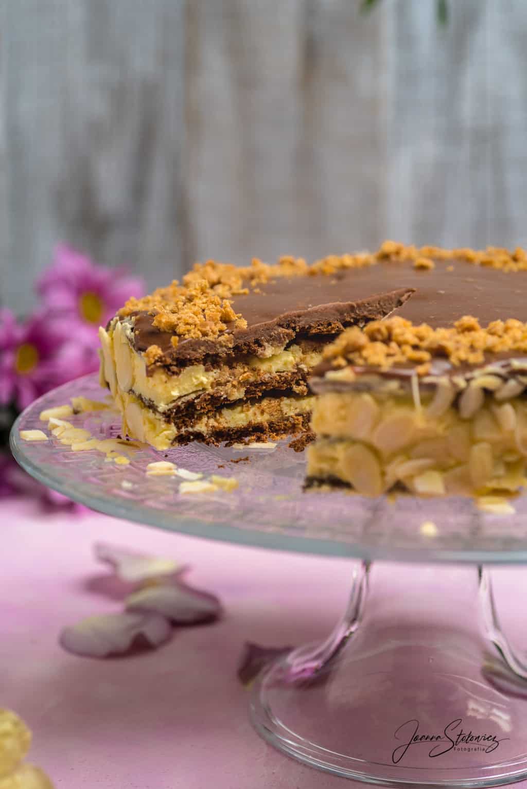 14. W obu wariantach ciasta – polać roztopioną czekoladą wierzch ciasta, posypać resztą pokruszonych cukierków. Boki udekorować płatkami migdałów. Wstawić do lodówki na kilka godzin.
