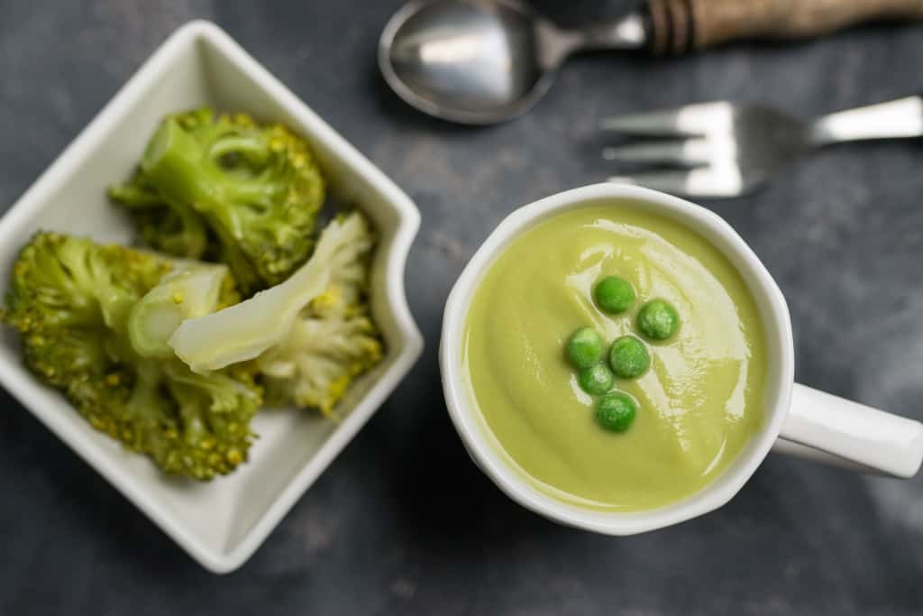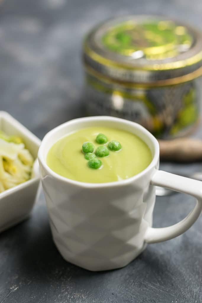 Niepowtarzalny smak tej zupie nadaje połączenie korzenia selera z groszkiem. U mnie oczywiście nie ma rozmrażania groszku, kto by miał czas na takie zabiegi. 😉 Mrożony groszek trafia od razu do naczynia miksującego i doskonale się gotuje. Dodatkiem do zupy są gotowane na parze brokuły, które uwielbiam.
